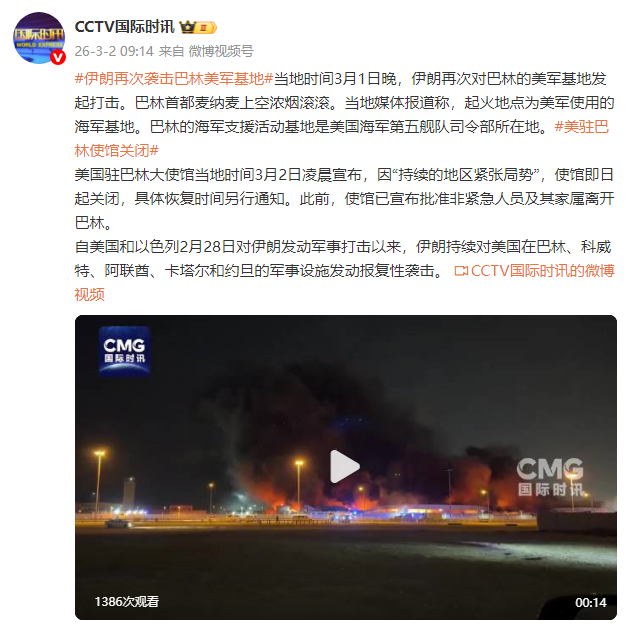 当地时间3月1日晚,伊朗再次对巴林的美军基地发起打击。巴林首都麦纳麦上空浓烟滚滚。当地媒体报道称,起火地点为美军使用的海军基地。巴林的海军支援活动基地是美国海军第五舰队司令部所在地。